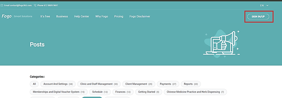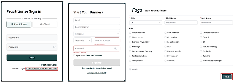 Step 2: Landing page will show you options to Log in (existing client) or Sign Up (No accounts yet). For new clients, choose Creating a free Business Account. Make sure you choose one or more roles as per your profession(s) if applied.