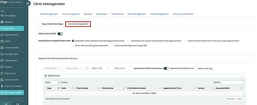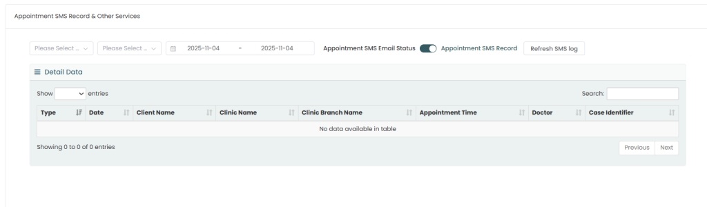 Step 5: Scroll down to the Appointment SMS Record & Other Services section to review your SMS history and settings. You can filter records by date, clinic name, or client name.