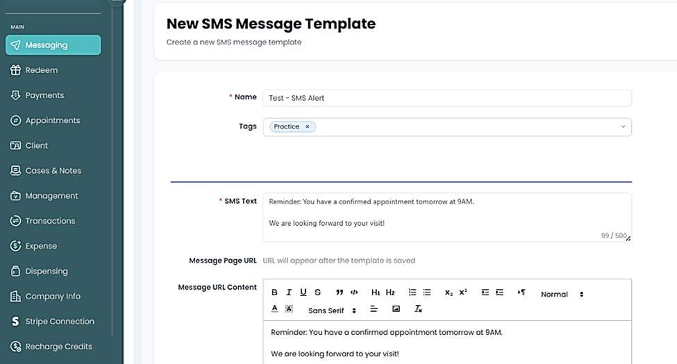 Step 2. Create your personalized SMS template. Include your message along with the appointment confirmation link (text URL), then click “Save.”