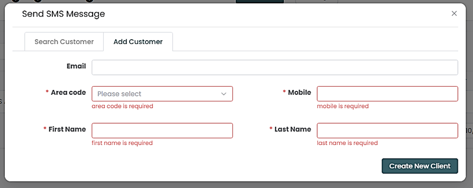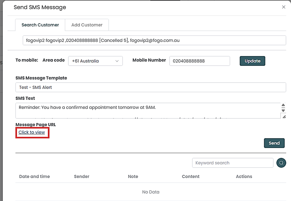 Step 5: Once Customer has been selected, type in the name of your template to populate your saved SMS Template. To view your text before sending, hit “Click to view” hyperlink. Then click “Send” once ready.