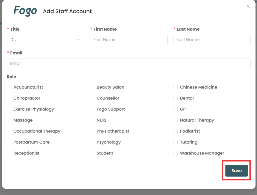 Adding practitioner/staff into your Fogo account must be completed before your practitioner/staff are able to use the Fogo system.