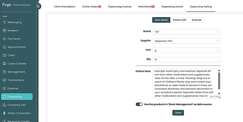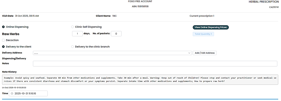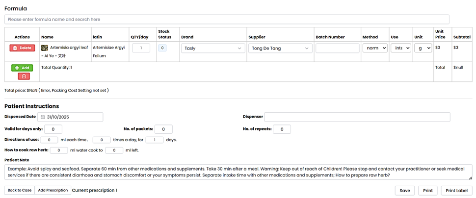 Step 2. The prescription page allows you to either dispense online or in the clinic. Input all information needed then save. You can print your prescription for customer copy or print the label of the herbs and granules prescribed.