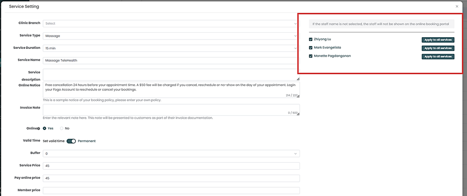 Step 4: Make sure to select the name of the staff who will handle the appointment for the selected services. If the staff name is not selected, the staff will not be shown on the online booking portal