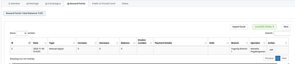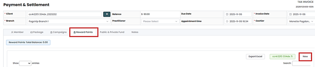 Step 3. If there are no points yet, Click “New” to top up clients’ rewards points (if necessary).