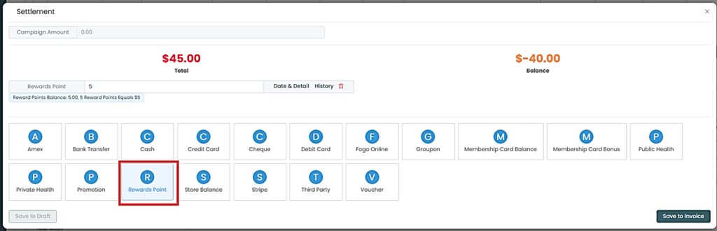 Step 5. Once on the Settlement page, select “Rewards Points”, then enter the client’s available points. This will be deducted to the balance due. Then select the 2nd mode of payment to pay off the remaining balance.