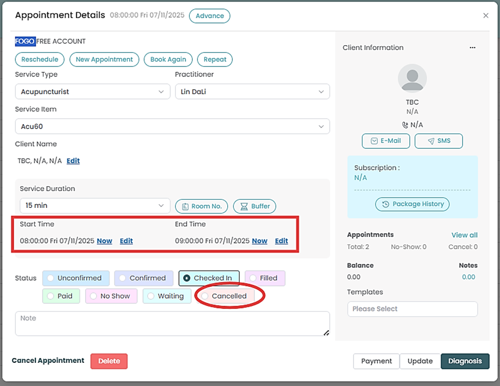 Step 6:The system will automatically update the appointment status to “Cancelled” and free up the time slot for rebooking.