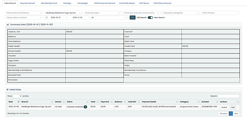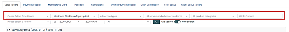 The Fogo System provides a comprehensive Sales Record page where you can review all client transactions, payment details, and sales performance within a selected date range.