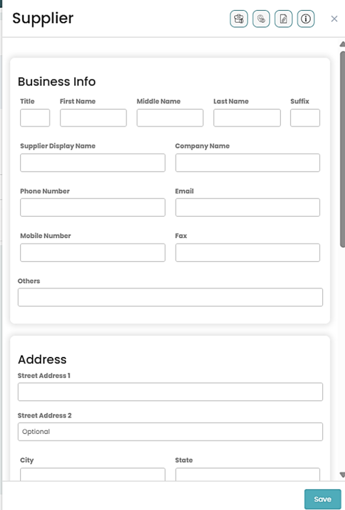 Step 2. Input supplier information in the supplier form then hit “Save”. Make sure to enter the supplier’s Business Info (name, company name, contact details) and Address (street, city, state, postal code). You may also include an email or mobile number for communication.