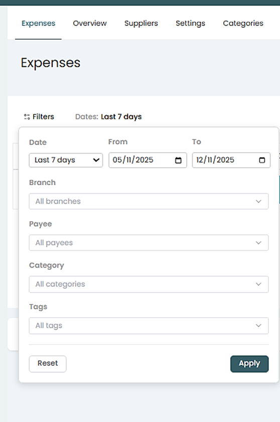 Step 3. To View overall expenses, go to “Expenses”, then filter month coverage. then “Apply”