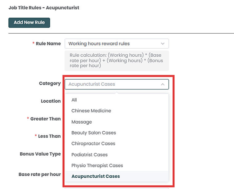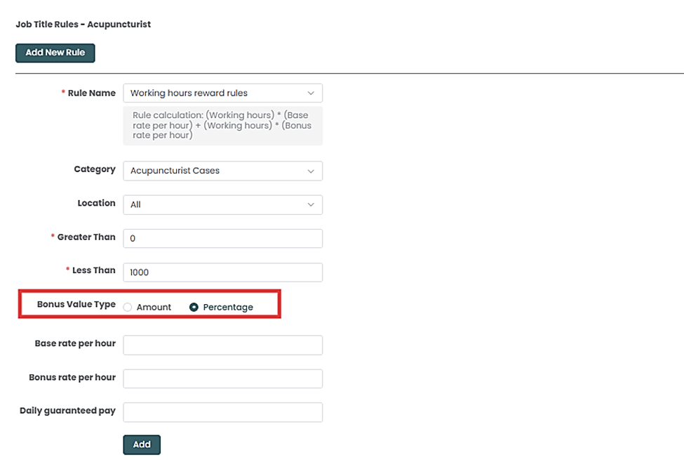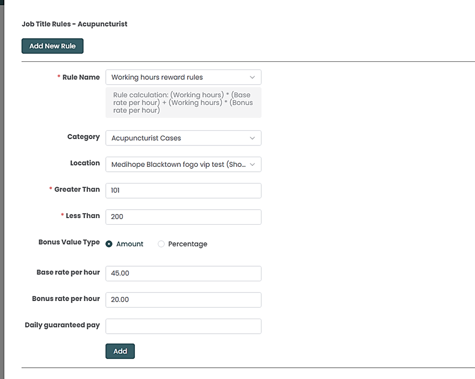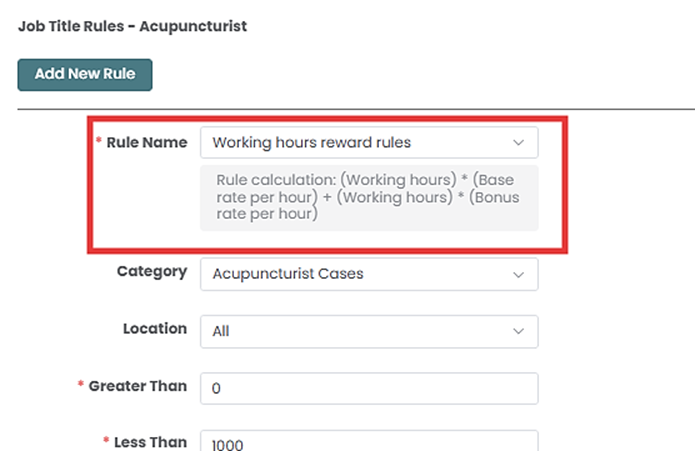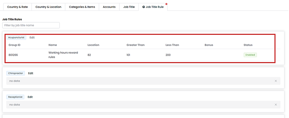 Step 2. Select Job Title: Review the list of defined Job Titles (e.g., Acupuncturist, Chiropractor). Click the “Add” button or the Job Title name for which you want to create a rule. This will open the “Job Title Rules” pop-up modal. Click “Edit” then a pop up window will show the parameters that need to be set for the rule. Select Working hours reward rules